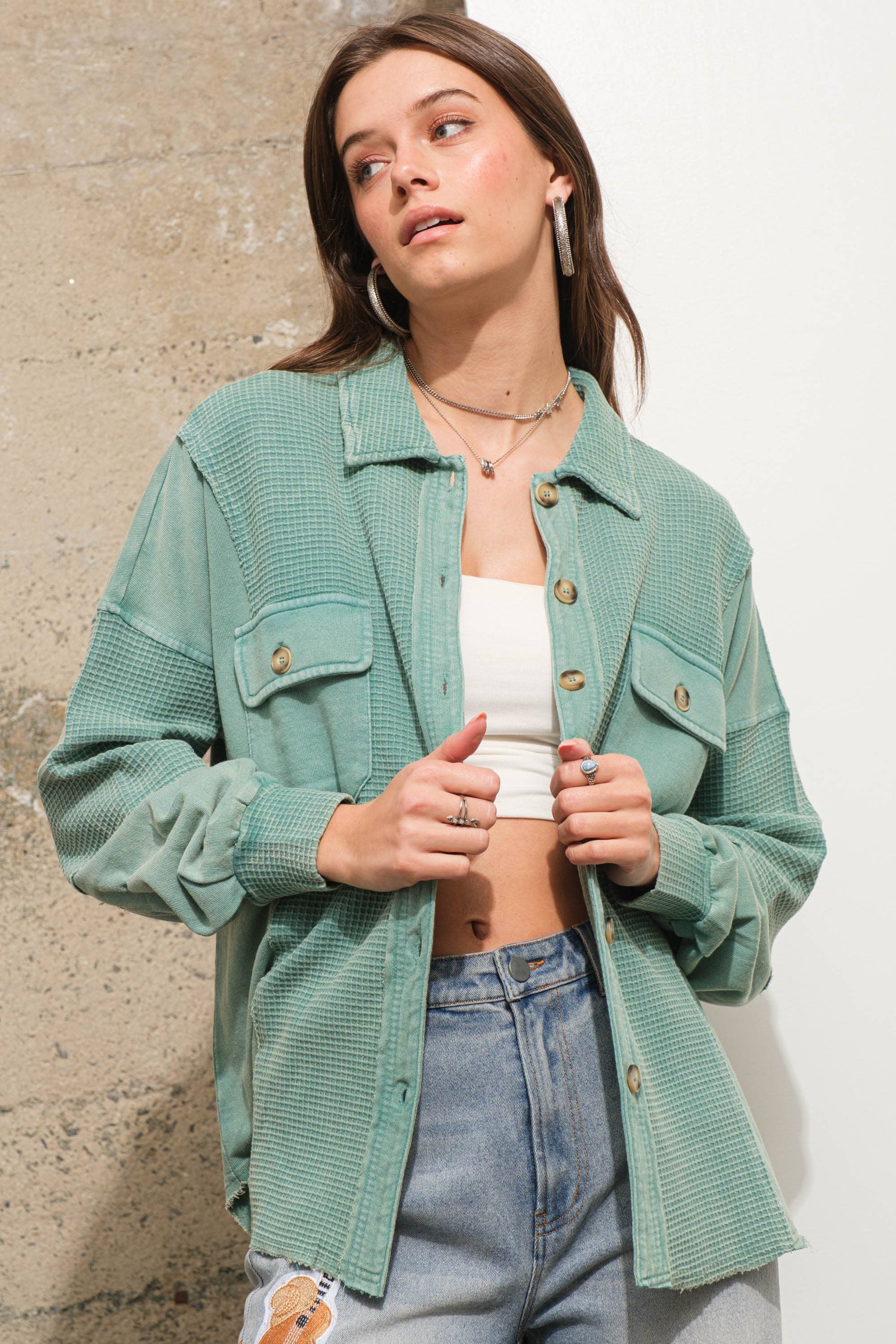 Garment washed french terry waffle mix button up knit shirt jacket.